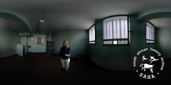 This colour photograph showing a panoramic view of Dr Elizabeth (Liz) Floyd in a cell at the Johannesburg Central Police Station (previously known as John Vorster Square) was taken by Craig Matthew of DOXA for the Sunday Times Heritage Project (STHP) - a joint project between SAHA and the Sunday Times, 2007. Included in "Between Life and Death: Stories from John Vorster Square" - a DVD produced as part of this project, 2007 and the SAHA online exhibition - 'Between Life and Death: Stories from John Vorster Square', 2012. |