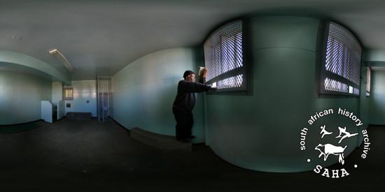 This colour photograph showing a panoramic view of Pheto Molefe in a cell at the Johannesburg Central Police Station (previously known as John Vorster Square) was taken by Craig Matthew of DOXA for the Sunday Times Heritage Project (STHP) - a joint project between SAHA and the Sunday Times, 2007. Included in "Between Life and Death: Stories from John Vorster Square" - a DVD produced as part of this project, 2007 and the SAHA online exhibition - 'Between Life and Death: Stories from John Vorster Square', 2012. |
