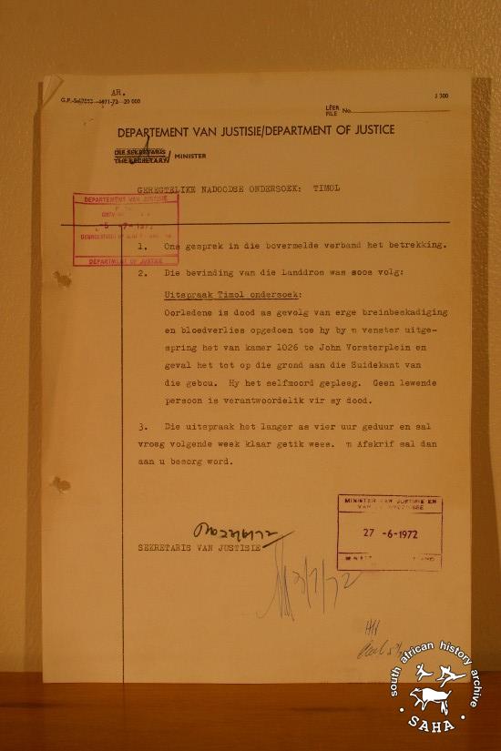 This document by the Department of Justice, dated 27 June 1972 contains the inquest findings on the death of Ahmed Timol. Timol fell to his death from the 10th floor of John Vorster Square on 27 October 1971. The police claimed that Timol had committed suicide; an excuse backed up by the official inquest, even though state pathologist Dr Jonathan Gluckman noted that Timol's body showed signs of being beaten before his death.
