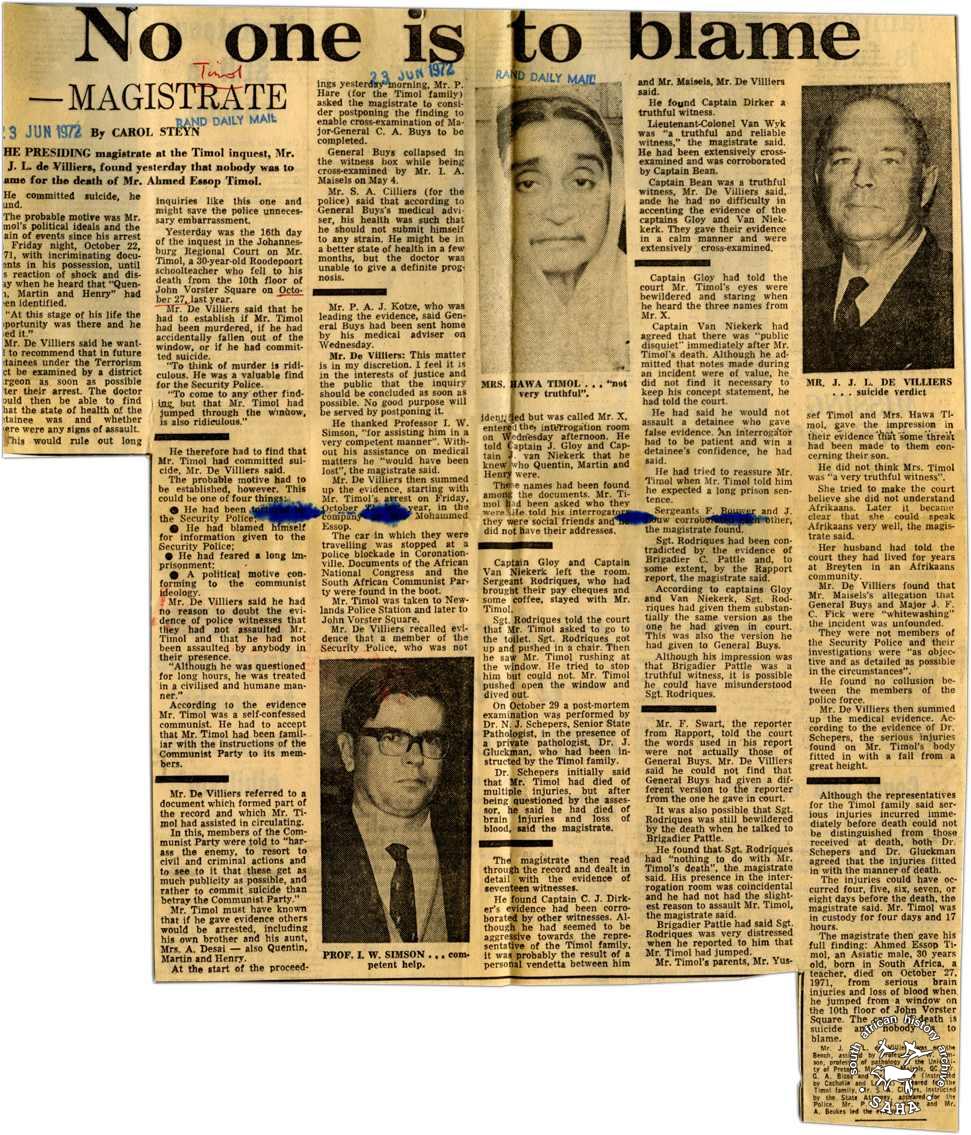 This article titled 'No one is to blame' by Carol Steyn was published in the Rand Daily Mail of 23 June 1972. This newspaper clipping is included in "Between Life and Death: Stories from John Vorster Square" - a DVD produced as part of this project.