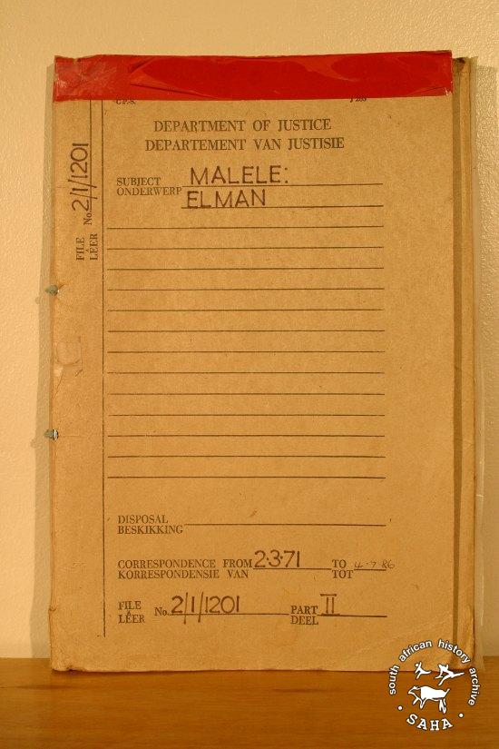 This is the front cover of the Department of Justice security file on Elmon Malele. Malele, arrested on 10 January 1977, died of a brain haemorrhage at the Princess Nursing Home in Johannesburg on 20 January 1977 after he had allegedly lost his balance after standing six hours (a standard torture technique) and hitting his head on the corner of a table at John Vorster Square. This front cover is included in "Between Life and Death: Stories from John Vorster Square" - a DVD produced as part of this project.