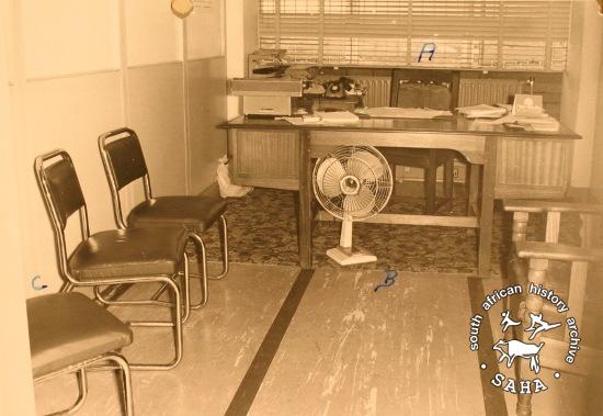 This security police photograph shows the office in John Vorster where Elmon Malele hit his head on the corner of a table. Arrested on 10 January 1977, Malele died of a brain haemorrhage at the Princess Nursing Home in Johannesburg on 20 January 1977 after he had allegedly lost his balance after standing six hours (a standard torture technique) and hitting his head on the corner of a table at John Vorster Square. This photograph is included in "Between Life and Death: Stories from John Vorster Square" - a DVD produced as part of this project.