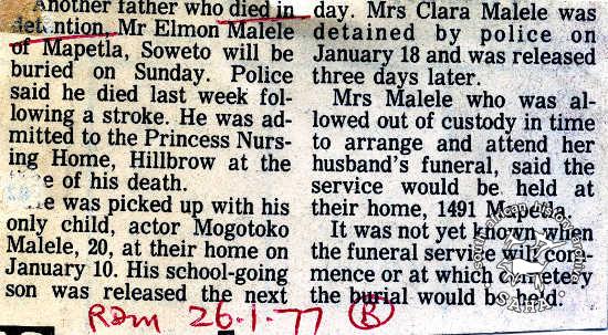 This article on the death of Elmon Malele was published in the Rand Daily Mail of 26 January 1977. This newspaper clipping is included in "Between Life and Death: Stories from John Vorster Square" - a DVD produced as part of this project.
