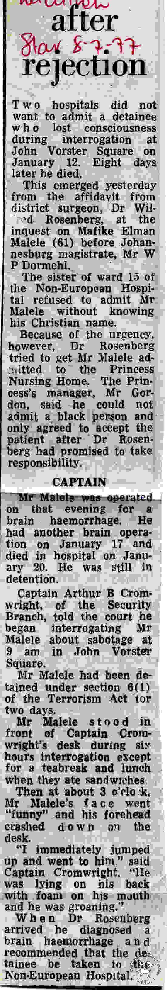 This article with incomplete title was published in the Star of 8 July 1977 and relates to death in detention of Elmon Malele on 20 January 1977. This newspaper clipping is included in "Between Life and Death: Stories from John Vorster Square" - a DVD produced as part of this project.