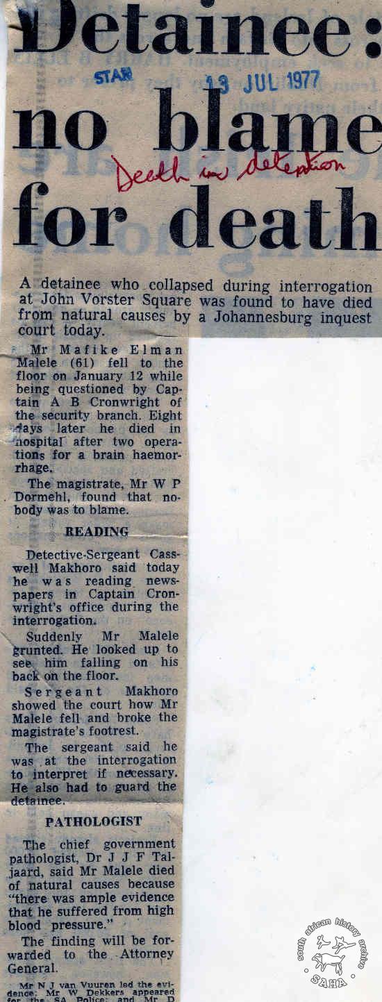 was published in the Star of 13 July 1977. This newspaper clipping is included in "Between Life and Death: Stories from John Vorster Square" - a DVD produced as part of this project.