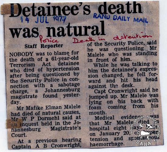 was published in the Rand Daily Mail of 14 July 1977. This newspaper clipping is included in "Between Life and Death: Stories from John Vorster Square" - a DVD produced as part of this project.