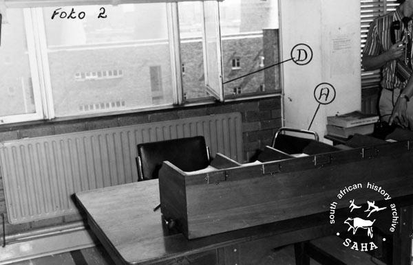 This black and white photograph shows the interior of the office in John Vorster Square where Mojo Mabelane allegedly climbed onto the window ledge. He plunged to his death from the 10th floor of John Vorster Square on 15 February 1977. This photograph is included in "Between Life and Death: Stories from John Vorster Square" - a DVD produced as part of this project.