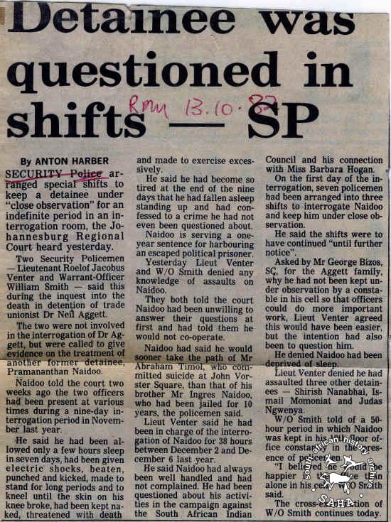 This article titled 'Detainee was questioned in shifts - SP' was published in the Rand Daily Mail of 13 October 1982. This newspaper clipping is included in "Between Life and Death: Stories from John Vorster Square" - a DVD produced as part of this project.
