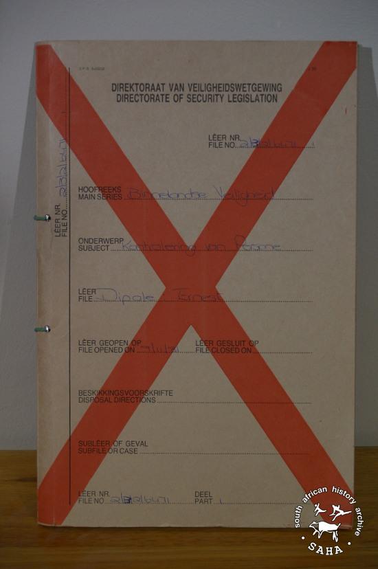 This is the front cover of the Department of Justice security file on Ernest Moabi Dipale, dated 9 November 1981. Dipale was found dead in his cell at John Vorster Square on 8 July 1982 - five months after the death of Neil Aggett. Only 21 at the time of his death, Dipale had been subjected to severe assault and torture, including the use of electric shocks. This front cover is included in "Between Life and Death: Stories from John Vorster Square" - a DVD produced as part of this project.