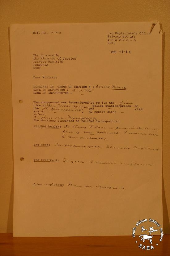 This is the first page of the report on Ernest Moabi Dipale to the Minister of Justice, dated 14 December 1981. This report is included in "Between Life and Death: Stories from John Vorster Square" - a DVD produced as part of this project.