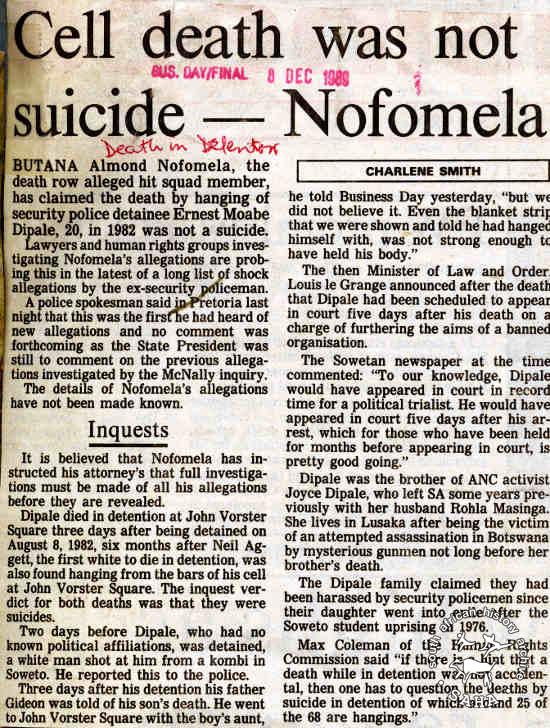 This article titled 'Cell death was not suicide - Nofomela' by Charlene Smith was published in the Business Day of 8 December 1989. This newspaper clipping is included in "Between Life and Death: Stories from John Vorster Square" - a DVD produced as part of this project.