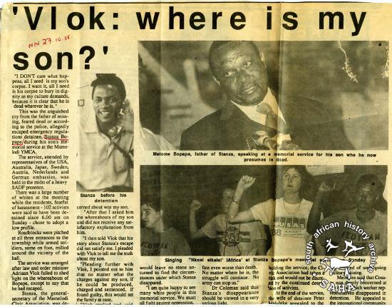 The first part of an article on Stanza Bopape titled 'Vlok: where is my son?' was published in the New Nation of 27 October 1988. This newspaper clipping is included in "Between Life and Death: Stories from John Vorster Square" - a DVD produced as part of this project.