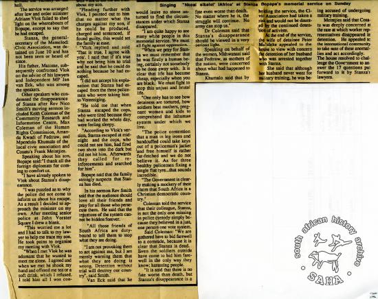 The second part of an article on Stanza Bopape titled 'Vlok: where is my son?' was published in the New Nation of 27 October 1988. This newspaper clipping is included in "Between Life and Death: Stories from John Vorster Square" - a DVD produced as part of this project.