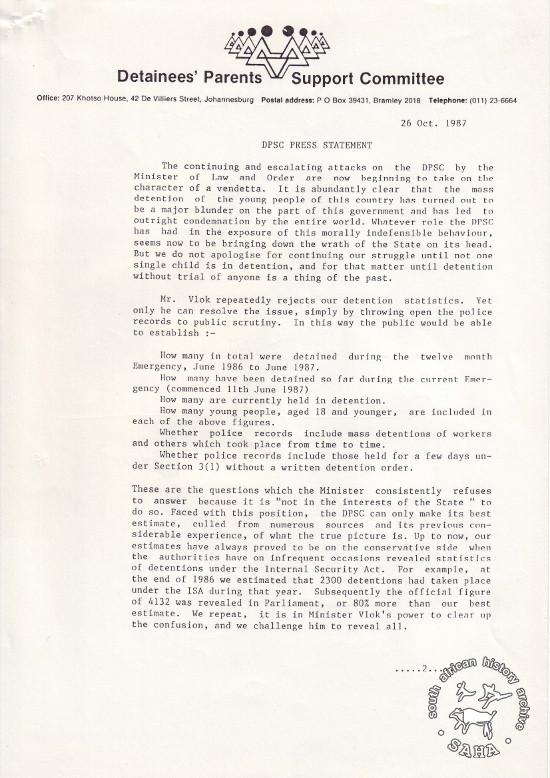 This is the first page of a press release on the continuing and escalating attacks on the Detainees' Parents Support Committee (DPSC) by the Minister of Law and Order, prepared by the DPSC on 26 October 1987. This press release is included in "Between Life and Death: Stories from John Vorster Square" - a DVD produced as part of the Sunday Times Heritage Project (STHP).