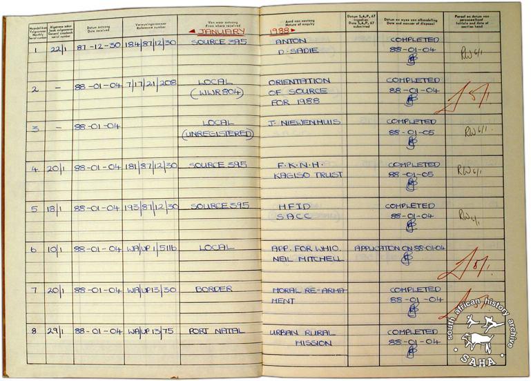 These pages of Warrant Officer Paul Erasmus's case book show entries for January 1988. This photograph is included in "Between Life and Death: Stories from John Vorster Square" - a DVD produced as part of this project.