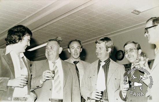 This photograph shows a group of security policemen socialising at the clubhouse after a day's work at John Vorster Square, date unknown. This photograph is included in "Between Life and Death: Stories from John Vorster Square" - a DVD produced as part of this project.