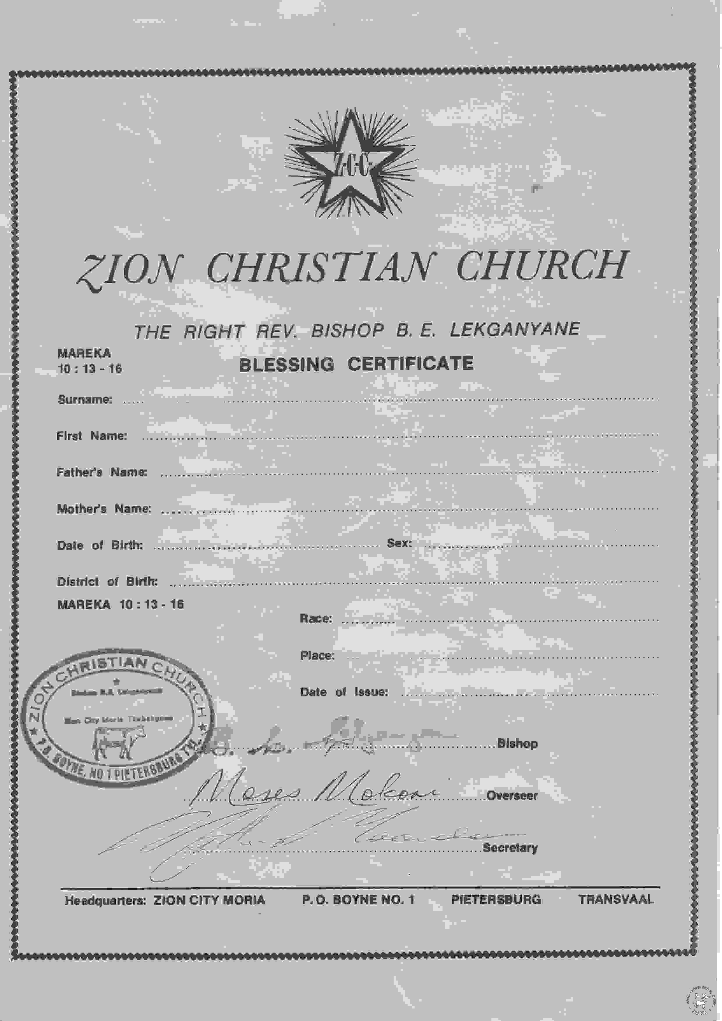 A3.9.1.8.3_4.6 :: This certificate of blessing from the Zion Christian Church serves as an example of primary source material.