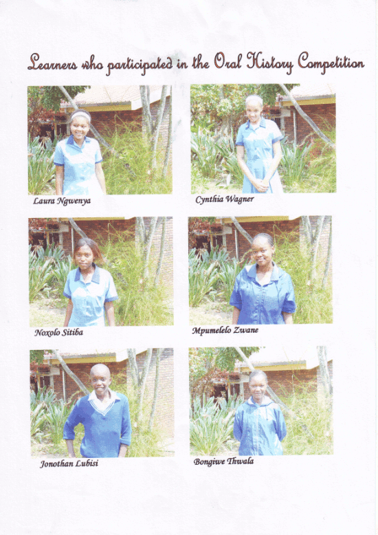 A collage of Nelsville Combined learners who participated in the oral history competition in 2009, included in the oral history portfolio of Social Sciences educator Bernadine Mandisa Dlozi from Nelsville Combined School |
