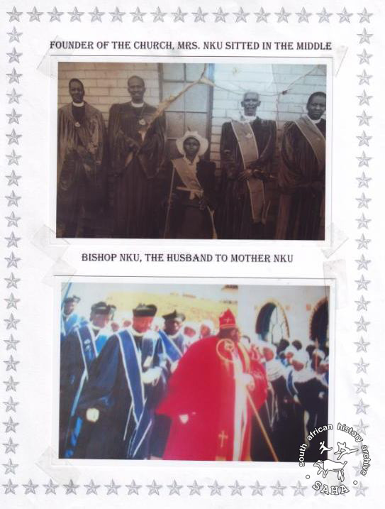 This document includes a photograph of Mrs Nku, the founder of the Apostolic Faith Mission and her husband, Bishop Nku, as depicted by learner Martha Matshogo’s oral history research project on the ‘unique’ history of St John’s Apostolic Faith Mission. |