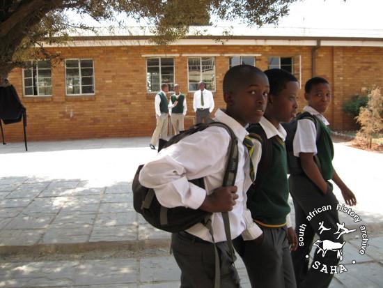 This colour photograph of students on their way to the classroom at Tembisa High School was taken by Mmatjatji Malabela during a visit to the school on 9 September 2010 to take photographs for the SAHA project "Voices from Below: an oral and photographic community history of Tembisa".