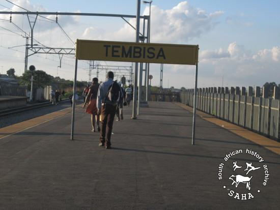 This colour photograph of people walking on the platform at Tembisa Station was taken by Mmatjatji Malabela on 30 November 2010 for the SAHA project "Voices from Below: an oral and photographic community history of Tembisa".