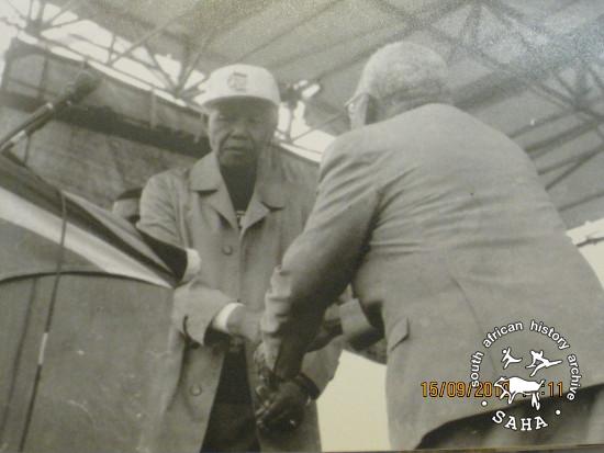 This black and white photograph of Nelson Mandela shaking hands with Phineas Mapheto was collected from Mapheto and digitised for the SAHA project "Voices from Below: an oral and photographic community history of Tembisa".
