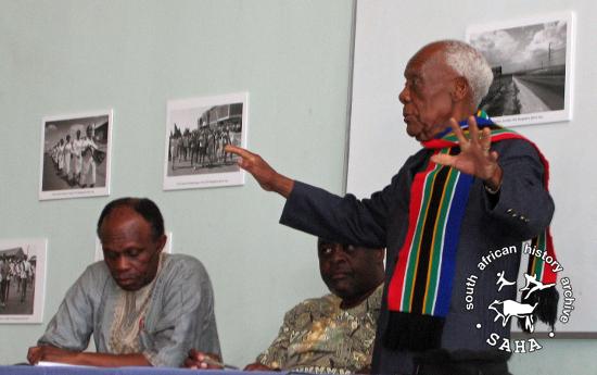 This is a colour photograph of Sello Serote, Greg Malebo and Reverend Mapheto during the panel discussion at the launch of the 'Entering Tembisa' exhibition held in the Tembisa West Library in celebration of Heritage Day 2011. This photograph was taken by Gille de Vlieg for the SAHA project “Voices from Below: An Oral and Photographic Community History of Tembisa Project”.