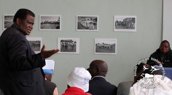 This is a colour photograph of Goba Ndlovu addressing the panel at the launch of the 'Entering Tembisa' exhibition held in the Tembisa West Library in celebration of Heritage Day 2011. This photograph was taken by Gille de Vlieg for the SAHA project “Voices from Below: An Oral and Photographic Community History of Tembisa Project”.