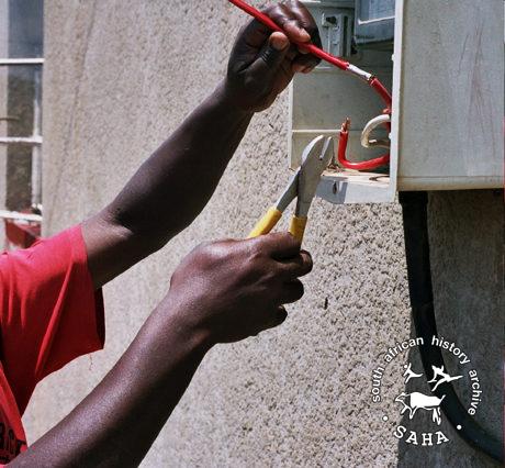 This is a digital born photograph of an activist of the Anti-Privatisation Forum (APF) reconnecting the electricity of a household in Soweto.