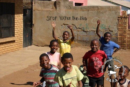 This digital born photograph of children playing in Phiri, Soweto against the backdrop of a wall with the words: "Stop water prepaid" was taken in 2007.