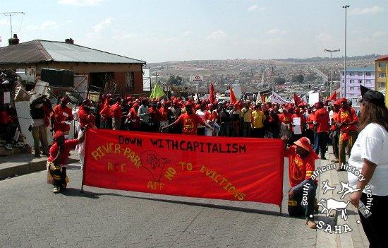 This is a digital born photograph of activists holding a banner during the Alexandra march. On 31 August 2002 and as part of the mobilisations targeting the World Summit on Sustainable Development (WSSD) between 20 000-25 000 people took part in a march from the poor township of Alexandra into the heart of Sandton, the home of the rich. The march was under the banner of the 'Social Movements United with the Anti-Privatisation Forum (APF) being the key social movement organising and mobilising for the march. As the image captures, the march was the largest non-ANC/Alliance gathering in the post-apartheid era.