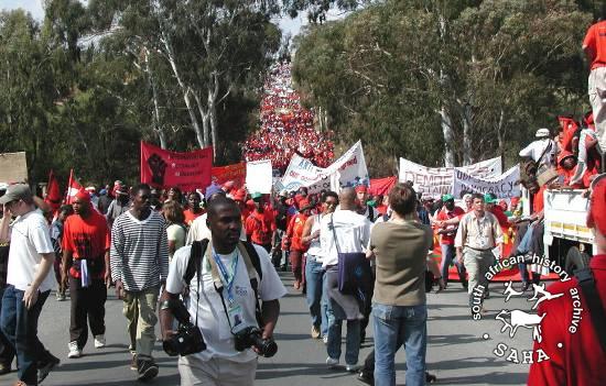 This is a digital born photograph of people taking part in the Alexandra march. On 31 August 2002 and as part of the mobilisations targeting the World Summit on Sustainable Development (WSSD) between 20 000-25 000 people took part in a march from the poor township of Alexandra into the heart of Sandton, the home of the rich. The march was under the banner of the 'Social Movements United with the Anti-Privatisation Forum (APF) being the key social movement organising and mobilising for the march. As the image captures, the march was the largest non-ANC/Alliance gathering in the post-apartheid era.