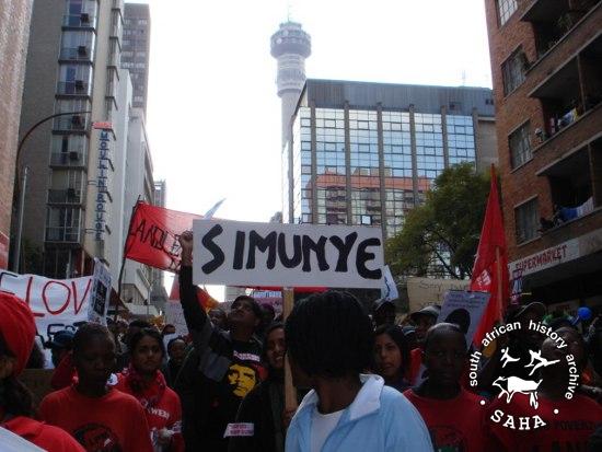 Holding a banner with the word "SIMUNYE" the crowds move through Hillbrow during an Anti-Xenophobia march, 2008 |