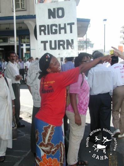 This digital born photograph of Virginia Setshedi holding a placard with the words "NO RIGHT TURN" was taken during an Anti-AGOA march in 2003.