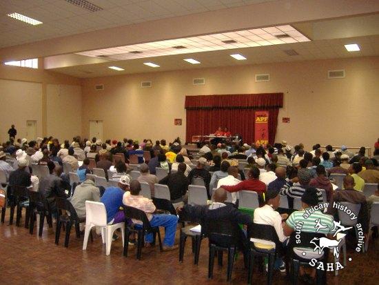 This is a digital born photograph taken at the Anti-Privatisation Forum (APF) Annual General Meeting (AGM) in 2008. The APF's first AGM was held in 2004 and then subsequently every year until 2010. Over the seven years of APF AGM's, the community affiliate membership increased from a base of around 12 affiliates to a high of over 30 affiliates. Intense democratic debate and open discussion as well as often highly contested leadership elections marked every AGM and provided the overall framework for the work and struggles of the APF throughout each year.