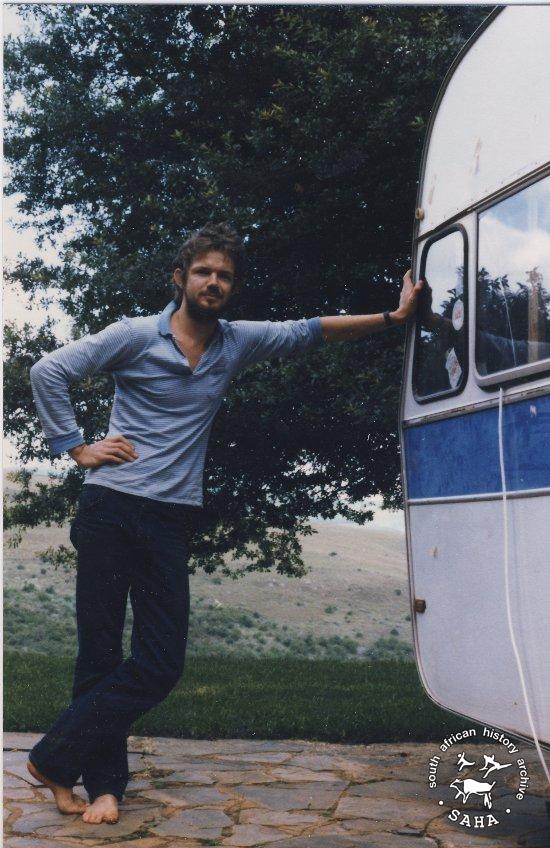 This is a colour photograph of Lloyd Ross next to the caravan used as the Shifty Mobile Studio, circa 1983. The photograph was digitised by the South African History Archive (SAHA) in 2014. Included in the SAHA physical and/or virtual exhibitions 'What you won't hear on the radio', developed to mark the 30th birthday of Shifty Records and the 25th anniversary of the Voƫlvry tour. |