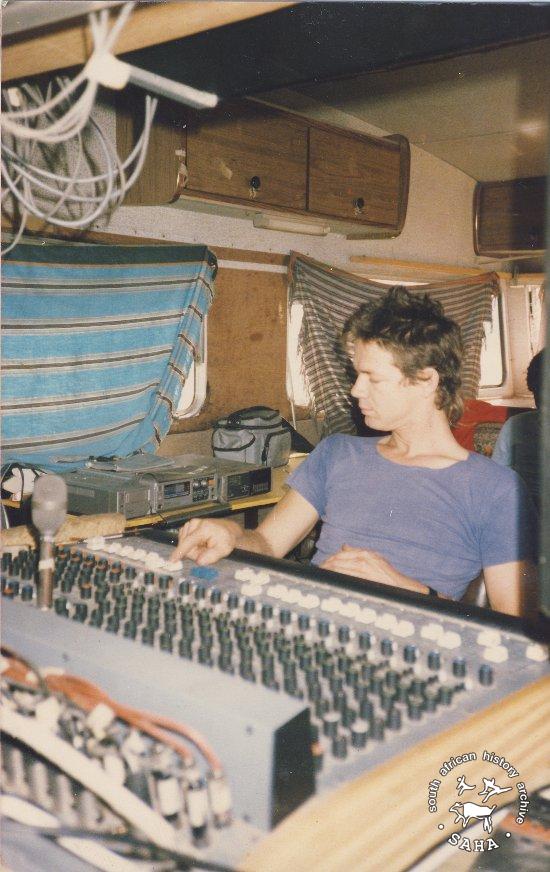 This is a colour photograph of Lloyd Ross at the mixing desk in the Shifty Mobile Studio, circa 1984. The photograph was digitised by the South African History Archive (SAHA) in 2014. Included in the SAHA physical and/or virtual exhibitions 'What you won't hear on the radio', developed to mark the 30th birthday of Shifty Records and the 25th anniversary of the Voƫlvry tour. |