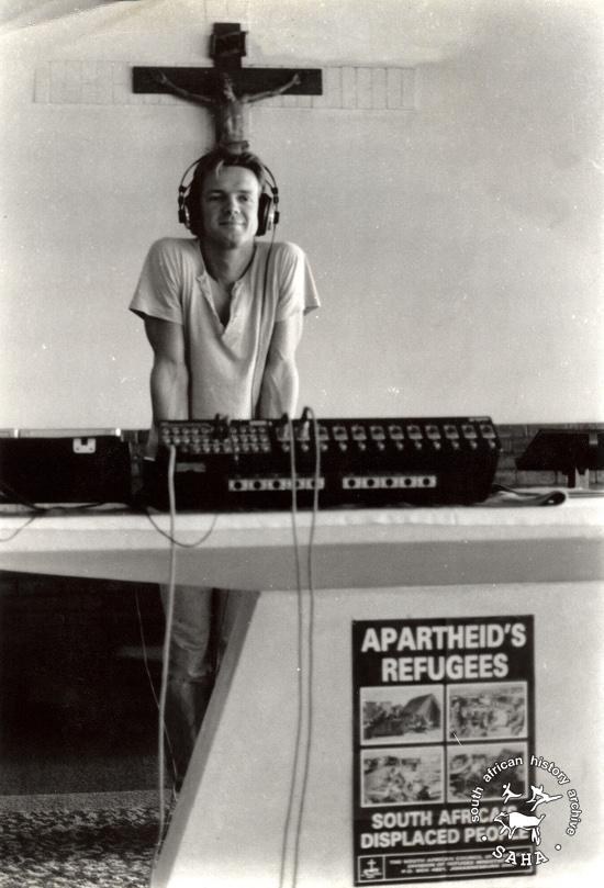 This is a black and white photograph of Lloyd Ross recording worker choirs in a church hall, June 1985. Digitised by the South African History Archive (SAHA) in 2014. Included in the SAHA physical and/or virtual exhibitions 'What you won't hear on the radio', developed to mark the 30th birthday of Shifty Records and the 25th anniversary of the Voƫlvry tour. |