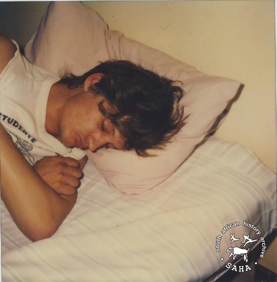 This is a colour photograph of James Phillips asleep, photographer and date unknown. This photograph was digitised by the South African History Archive (SAHA) in 2014. Included in the SAHA physical and/or virtual exhibitions 'What you won't hear on the radio', developed to mark the 30th birthday of Shifty Records and the 25th anniversary of the Voƫlvry tour. |