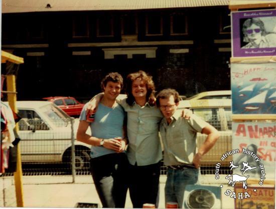 This is a colour photograph of James Phillips with Mark Bennett and friend selling Shifty Records merchandise at a stall, presumably in Johannesburg, circa 1985. Record covers of 'Wie is Bernoldus Niemand?', 'Sound Future' (Happy Ships), A Naartjie in our Sosatie' and 'Fosatu Worker Choirs' can be seen on the right. Photographer and date are unknown. This photograph was digitised by the South African History Archive (SAHA) in 2014. Included in the SAHA physical and/or virtual exhibitions 'What you won't hear on the radio', developed to mark the 30th birthday of Shifty Records and the 25th anniversary of the Voƫlvry tour. |