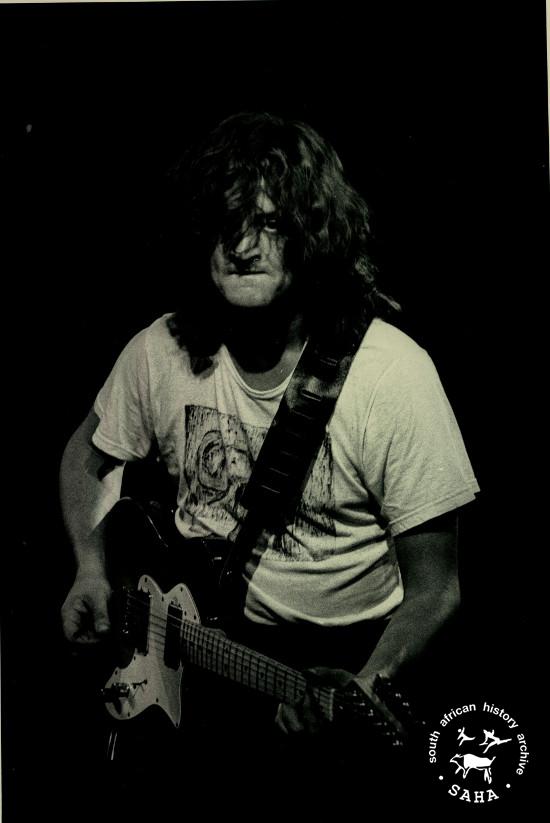 This is a black and white photograph of James Phillips performing, photographer and date unknown. This photograph was digitised by the South African History Archive (SAHA) in 2014. Included in the SAHA physical and/or virtual exhibitions 'What you won't hear on the radio', developed to mark the 30th birthday of Shifty Records and the 25th anniversary of the Voƫlvry tour. |