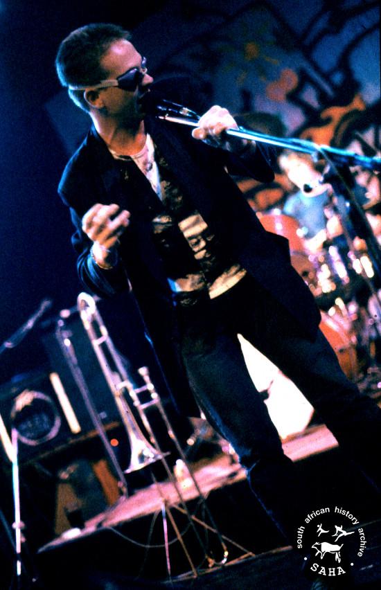 This is a colour photograph of Johannes Kerkorrel performing, photographer and date unknown. This photograph was digitised by the South African History Archive (SAHA) in 2014. Included in the SAHA physical and/or virtual exhibitions 'What you won't hear on the radio', developed to mark the 30th birthday of Shifty Records and the 25th anniversary of the Voƫlvry tour. |