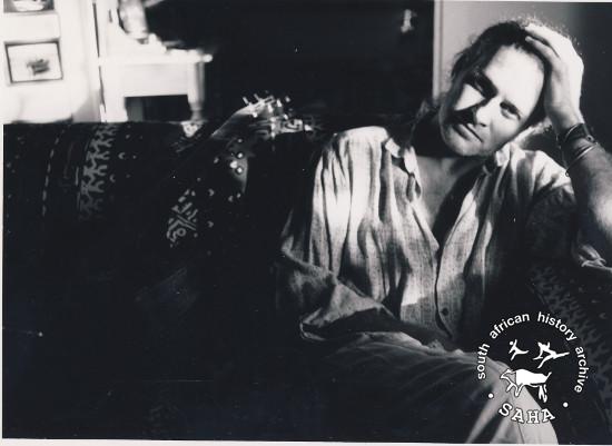 This is a black and white photograph of musician Tony Cox, photographer and date unknown. This photograph was digitised by the South African History Archive (SAHA) in 2014. Included in the SAHA physical and/or virtual exhibitions 'What you won't hear on the radio', developed to mark the 30th birthday of Shifty Records and the 25th anniversary of the Voƫlvry tour. |