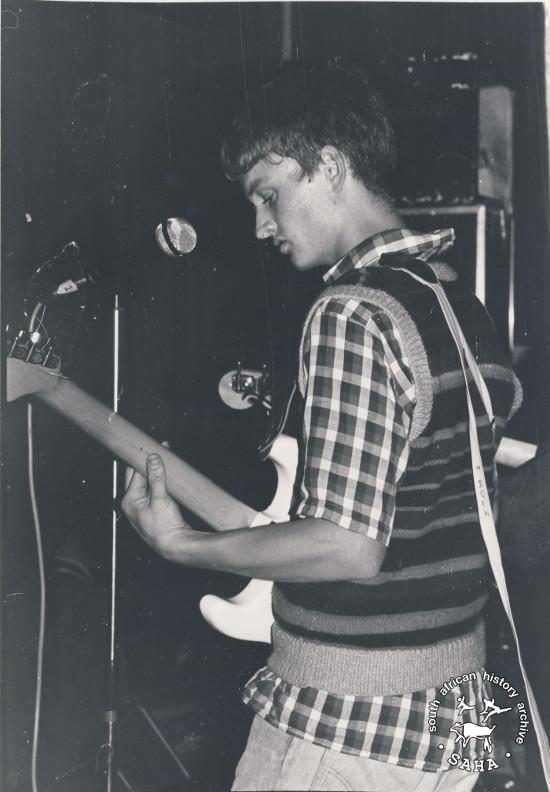 This is a black and white photograph of James Phillips performing in the band Corporal Punishment in the early 1980s. Photographer is unknown. This photograph was digitised by the South African History Archive (SAHA) in 2014. Included in the SAHA physical and/or virtual exhibitions 'What you won't hear on the radio', developed to mark the 30th birthday of Shifty Records and the 25th anniversary of the Voƫlvry tour. |