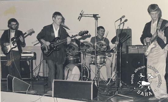 This is a black and white photograph of the band Corporal Punishment performing in the early 1980s. James Phillips is on the far right with band members Karl Helgard, Mark Bennett and Henry Jansen. Photographer is unknown. This photograph was digitised by the South African History Archive (SAHA) in 2014. Included in the SAHA physical and/or virtual exhibitions 'What you won't hear on the radio', developed to mark the 30th birthday of Shifty Records and the 25th anniversary of the Voƫlvry tour. |
