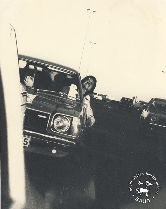 This is a black and white photograph of Corporal Punishment band members driving in a Mazda in Springs in the early 1980s with James Phillips leaning out of the window; photographer unknown. This photograph was digitised by the South African History Archive (SAHA) in 2014. Included in the SAHA physical and/or virtual exhibitions 'What you won't hear on the radio', developed to mark the 30th birthday of Shifty Records and the 25th anniversary of the Voƫlvry tour. |