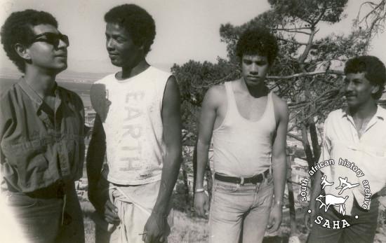 This is a black and white photograph of the Genuines band members (from left to right) Hilton Schilder, Mac MacKenzie, Ian Herman and Gerard O'Brien by Joelle Chesselet; date unknown. This photograph was digitised by the South African History Archive (SAHA) in 2014. Included in the SAHA physical and/or virtual exhibitions 'What you won't hear on the radio', developed to mark the 30th birthday of Shifty Records and the 25th anniversary of the Voƫlvry tour. |