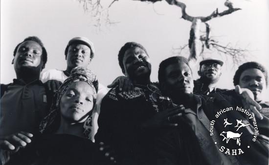 This is a black and white photograph of the Kgwanyape Band members by Lloyd Ross; date unknown. This photograph was digitised by the South African History Archive (SAHA) in 2014. Included in the SAHA physical and/or virtual exhibitions 'What you won't hear on the radio', developed to mark the 30th birthday of Shifty Records and the 25th anniversary of the Voƫlvry tour. |