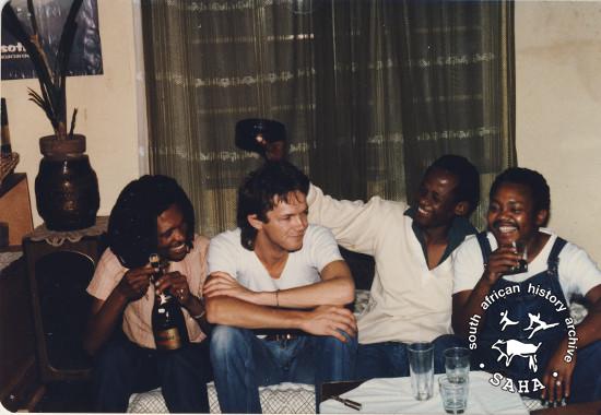 This is a colour photograph of Lloyd Ross with Sankomota band members (from left to right) Maruti Selate, Frank Leepa and Moss Nkofo, circa 1984. Photographer is unknown. This photograph was digitised by the South African History Archive (SAHA) in 2014. Included in the SAHA physical and/or virtual exhibitions 'What you won't hear on the radio', developed to mark the 30th birthday of Shifty Records and the 25th anniversary of the Voƫlvry tour. |
