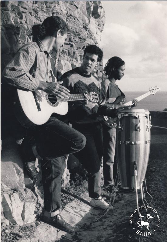 This is a black and white photograph of the Genuines band members (from left to right) Steve Newman, Ian Herman and Gito Baloi by Lloyd Ross; date unknown. This photograph was digitised by the South African History Archive (SAHA) in 2014. Included in the SAHA physical and/or virtual exhibitions 'What you won't hear on the radio', developed to mark the 30th birthday of Shifty Records and the 25th anniversary of the Voƫlvry tour. |